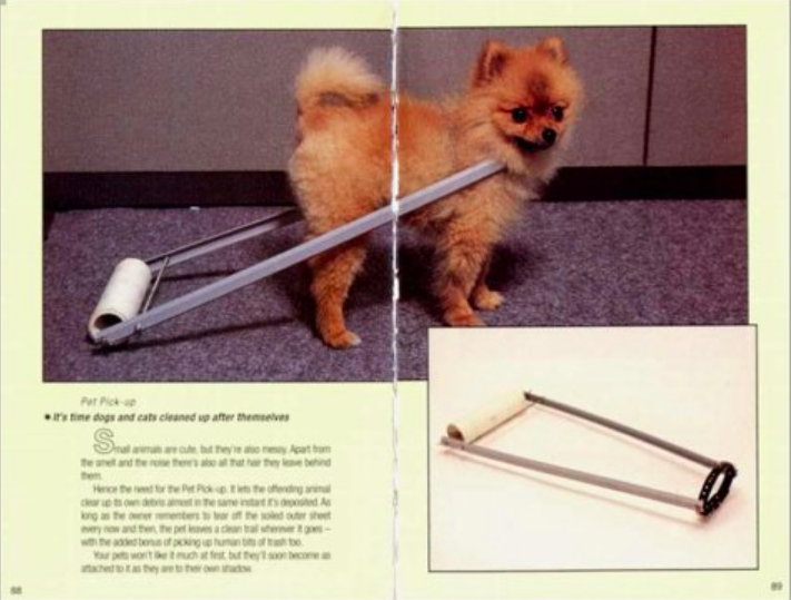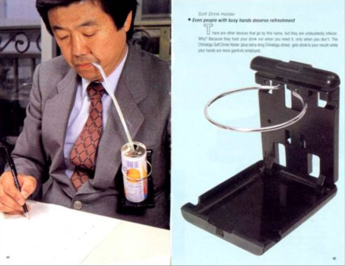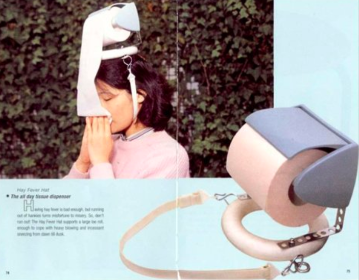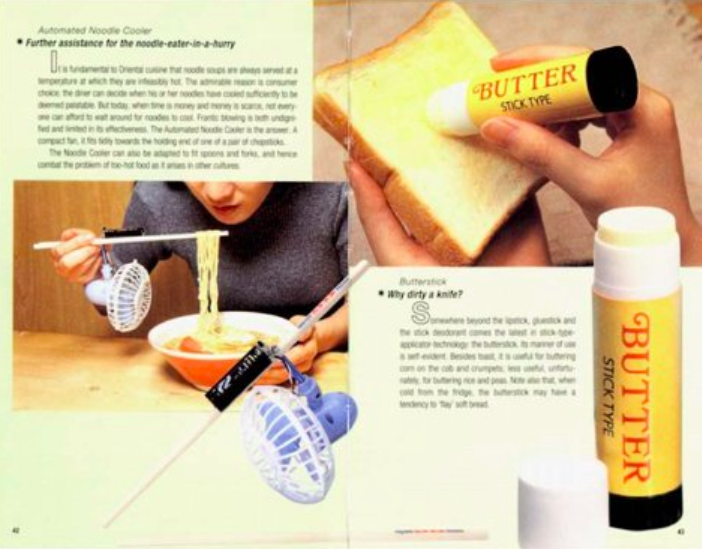 در دهه 1990 اغلب در کتابفروشی ها مجلاتی از مجموعه اختراعات ژاپنی بی مصرف در فروشگاه‌ها مطرح شدند. حدود صد محصول که با صراحتی بی نظیر عکس‌برداری و توصیف می‌شدند و سایر محصولات مصرفی را به روش‌های ظاهری عجیب و غریب ترکیب می‌کردند: چاپستیک‌هایی که با پنکه برقی مینیاتوری سعی در خنک کردن نودل‌های رامن در مسیر رسیدن به دهان بودند. کلاهی که با مکشی که به پنجره در مترو دارد می‌گذارد راحت بخوابید، زانو بندهای زمین پاک کن کودک که همزمان با محافظت از پای کودک شما زمین را هم پاک می‌کند، چتری که آب باران را ذخیره می‌کند و غیره. چنین محصولاتی برای افراد هم قابل قبول و هم غیرقابل قبول بودند.